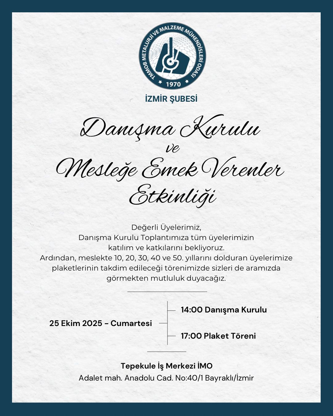 Danışma Kurulu Toplantımızın ardından, lisans mezuniyeti itibarı ile meslekte 10., 20., 30., 40. ve 50. yılında olan kıymetli meslektaşlarımız için Metalurjiye Emek Verenler Etkinliği gerçekleştirilecektir.