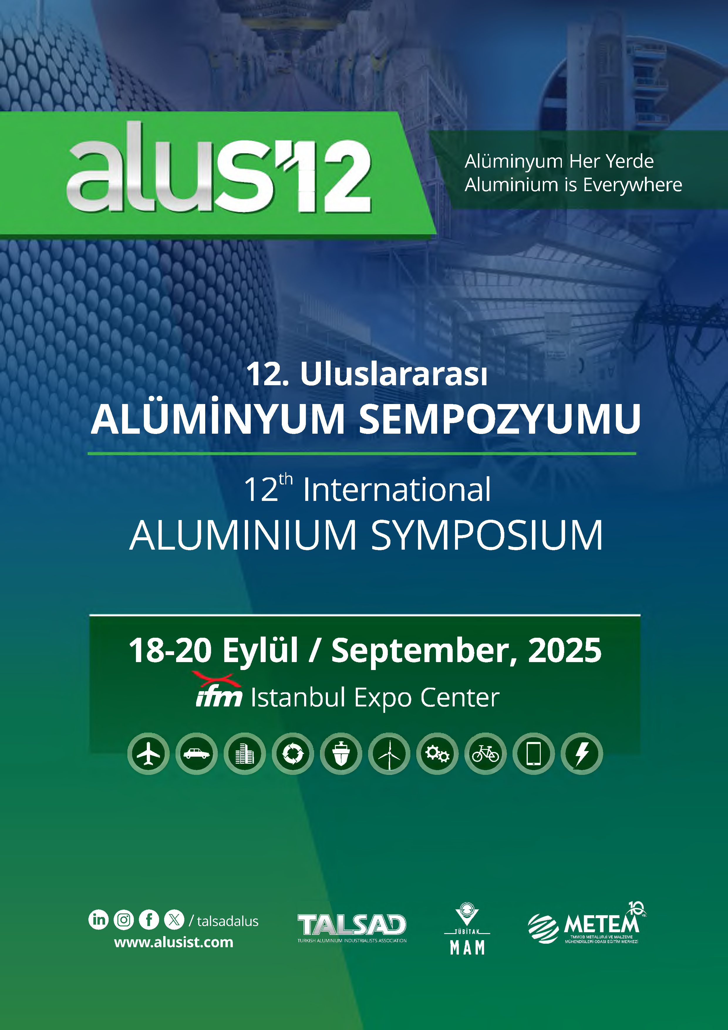 12. Uluslararası Alüminyum Sempozyumu, TALSAD Türkiye Alüminyum Sanayicileri Derneği, TÜBİTAK Marmara Araştırma Merkezi ve METEM TMMOB Metalurji ve Malzeme Mühendisleri Odası Eğitim Merkezi işbirliği ile 18-20 Eylül 2025 tarihlerinde Yeşilköy-İstanbul Fuar Merkezi'nde düzenlenecektir.