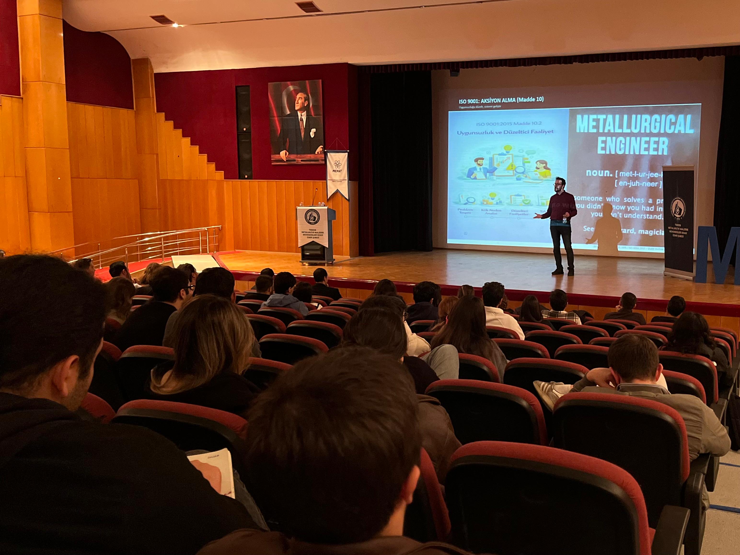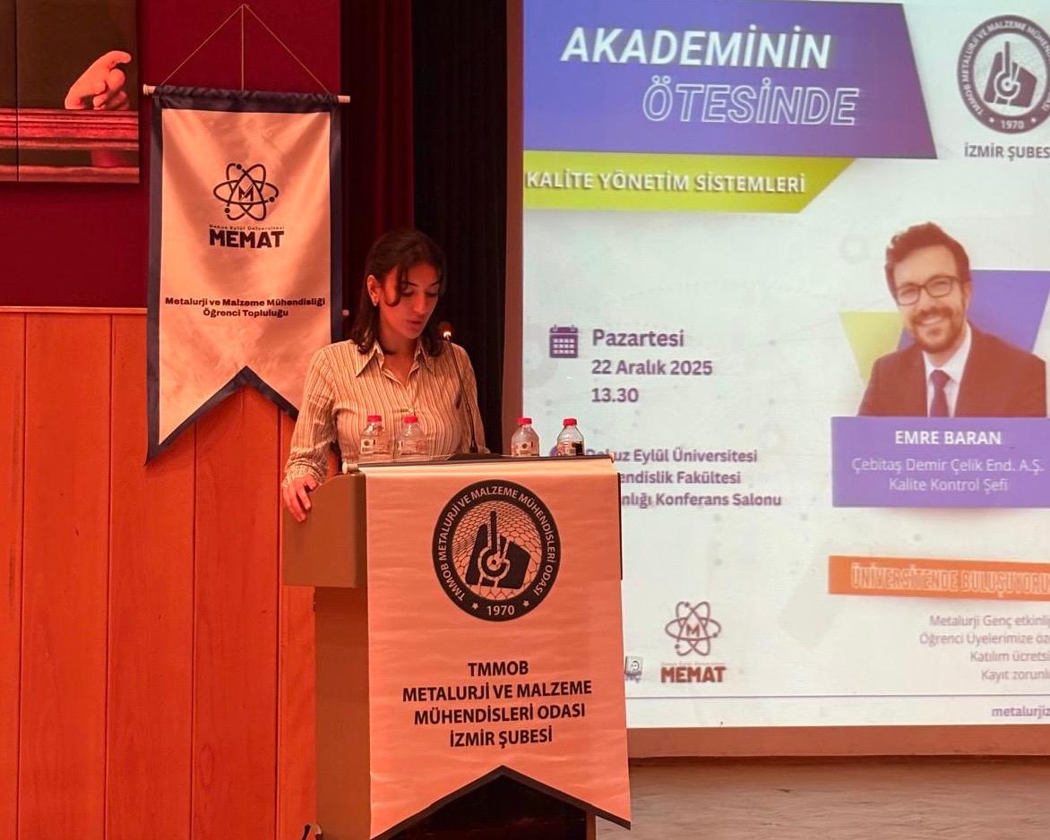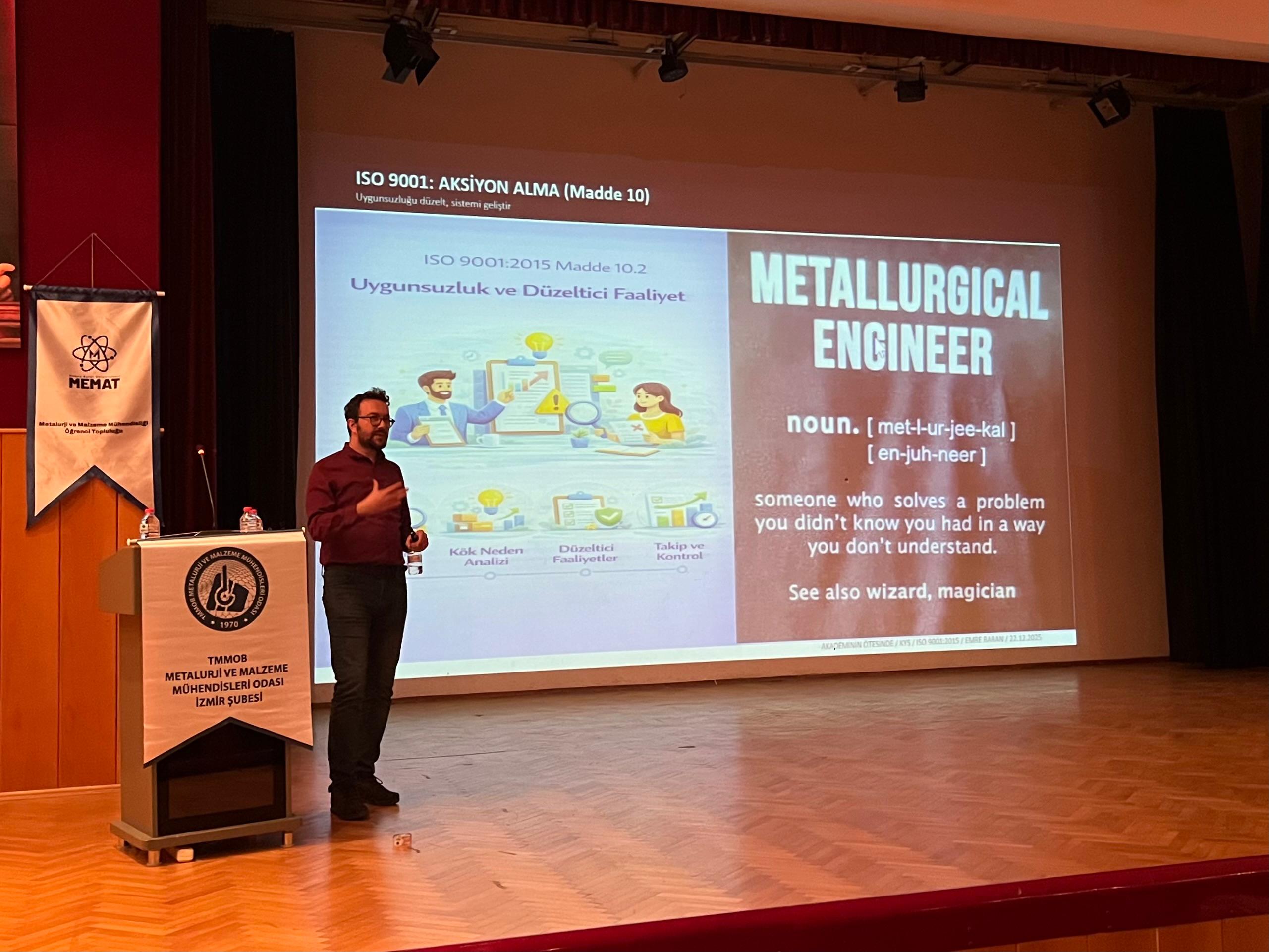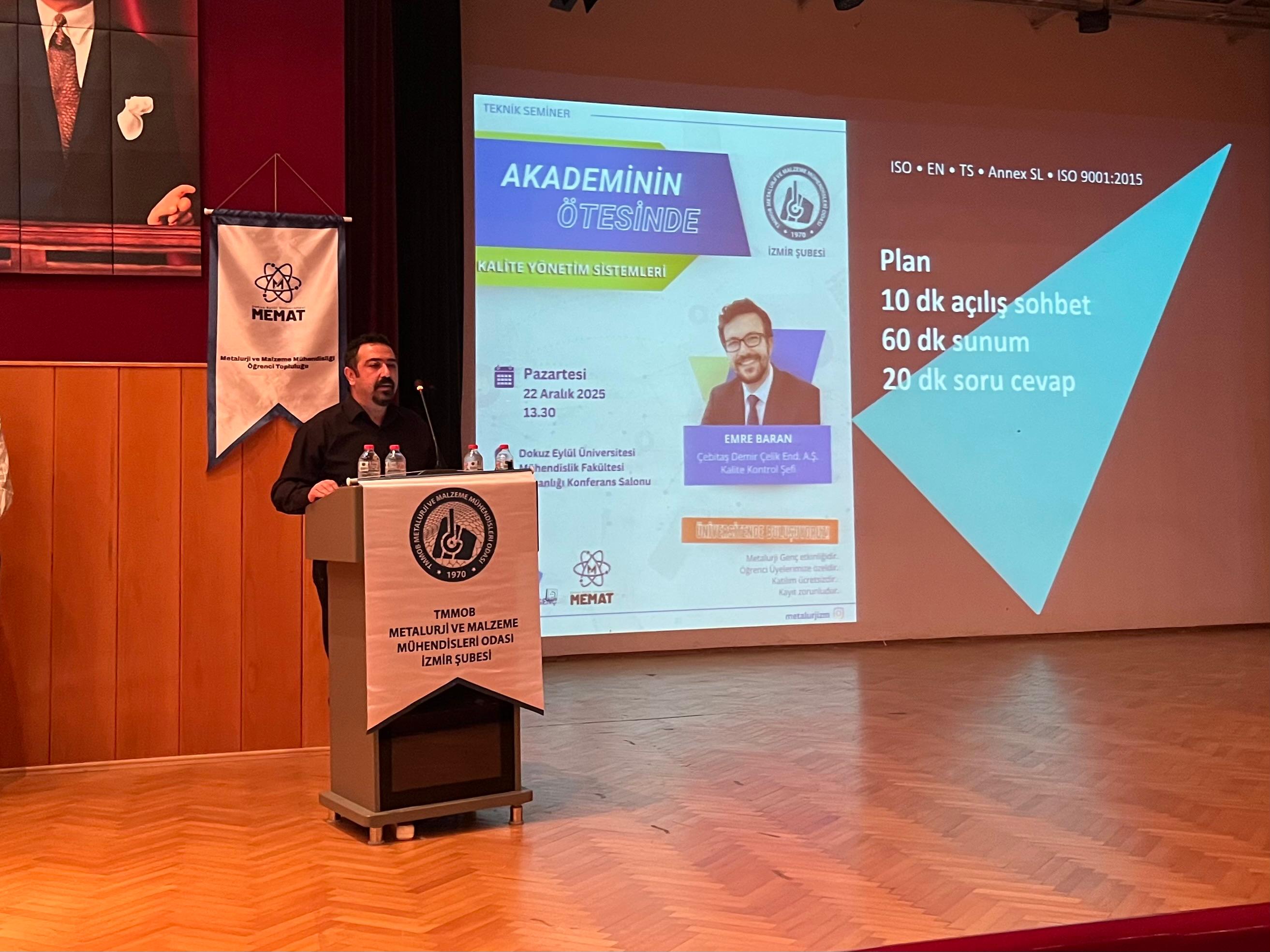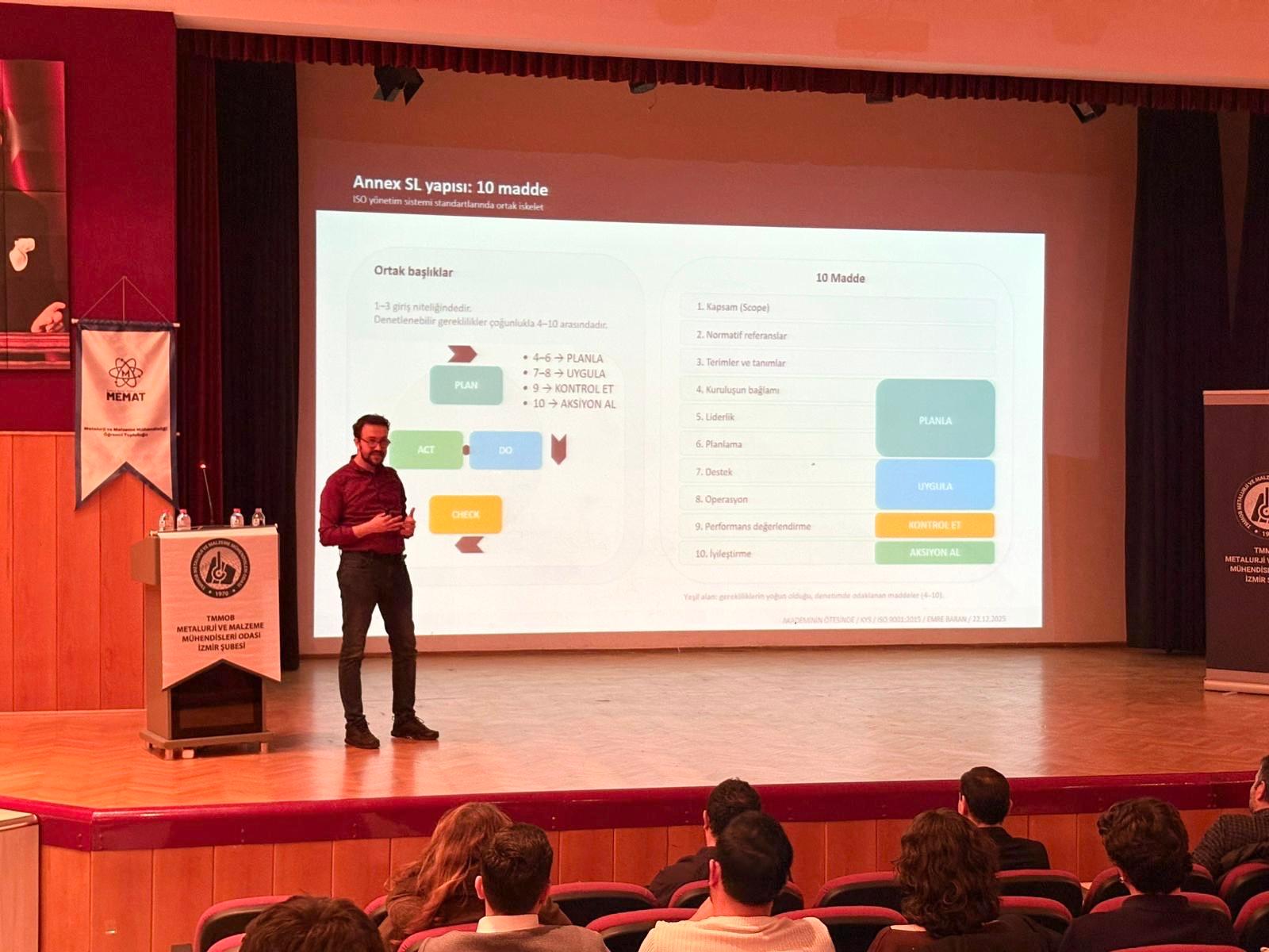 Program, Şube Yönetim Kurulu Üyemiz ve Çebitaş Demir Çelik Endüstrisi Kalite Kontrol Şefi Emre Baran’ın sunumuyla devam etti. Sunumda; kalite yönetim sistemleri, sertifikasyon süreçleri, sektördeki uygulamalar ve bu süreçlerin meslek hayatındaki önemi ele alındı. Etkinlik, katılımcıların sorularıyla zenginleşen soru–cevap bölümüyle tamamlandı.