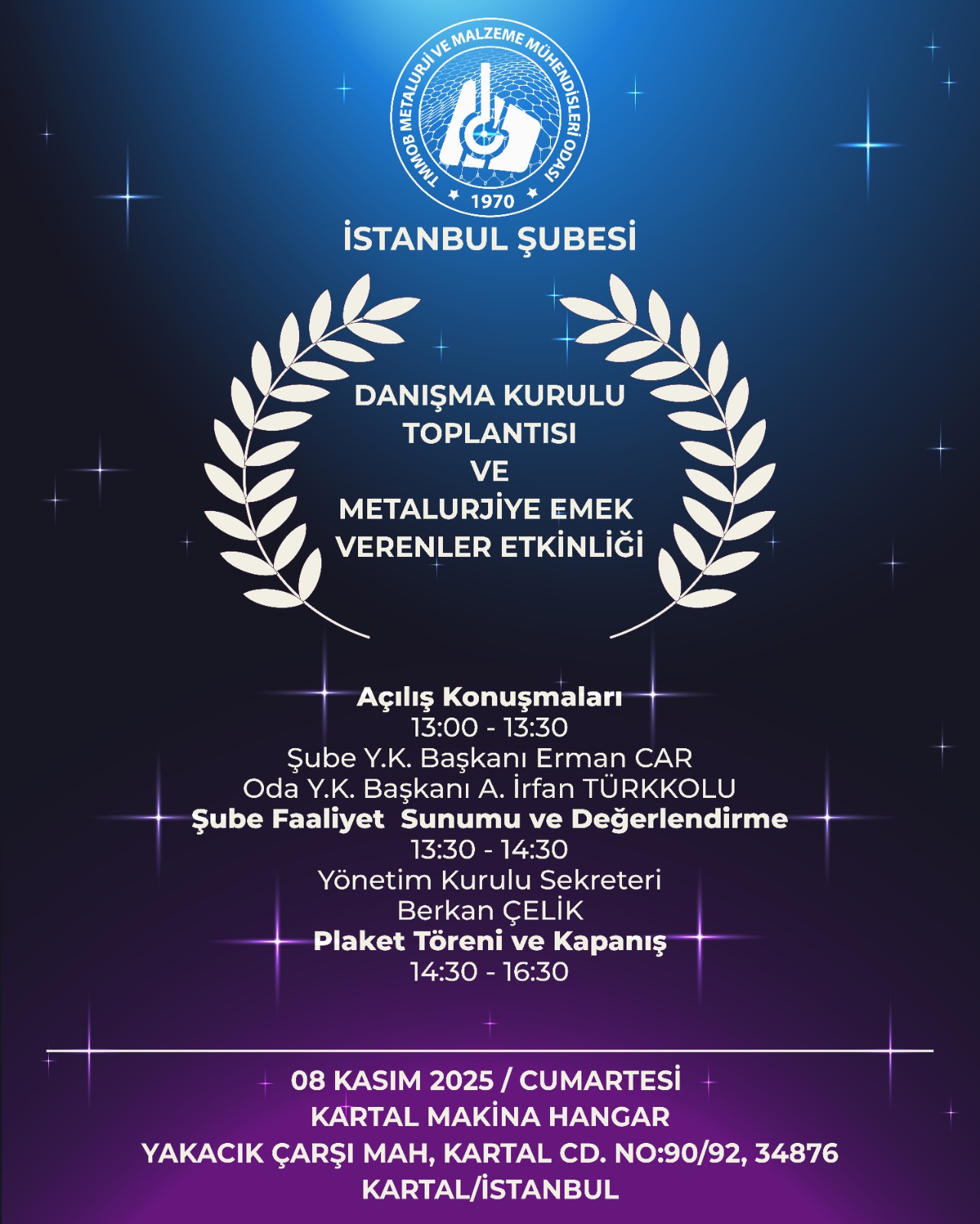 Danışma Kurulu Toplantımızın ardından, lisans mezuniyeti itibarı ile meslekte 10., 20., 30., 40. ve 50. yılında olan kıymetli meslektaşlarımız için Metalurjiye Emek Verenler Etkinliği gerçekleştirilecektir.