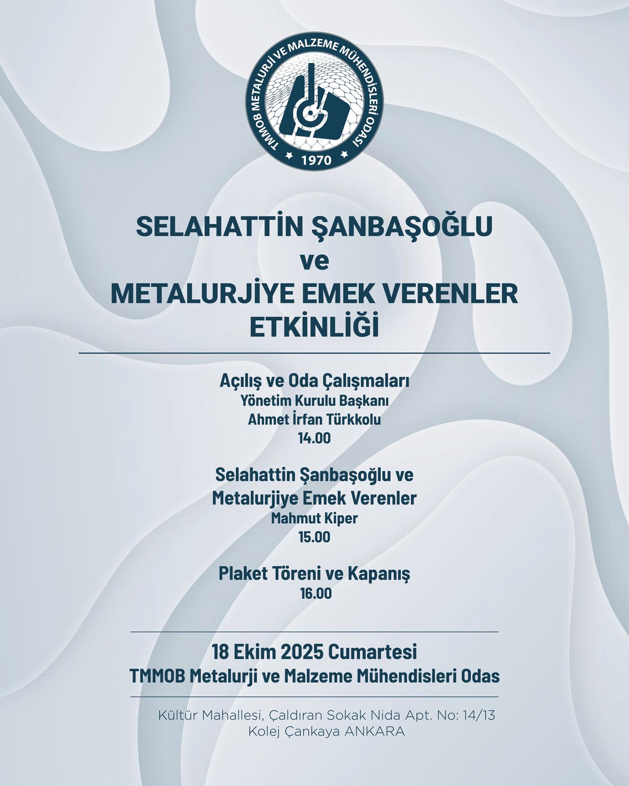 Her yıl olduğu gibi bu yılda SELAHATTİN ŞANBAŞOĞLU VE METALURJİYE EMEK VERENLER etkinliğimizi yapacağız ve meslektaşlarımıza plaket vereceğiz.
