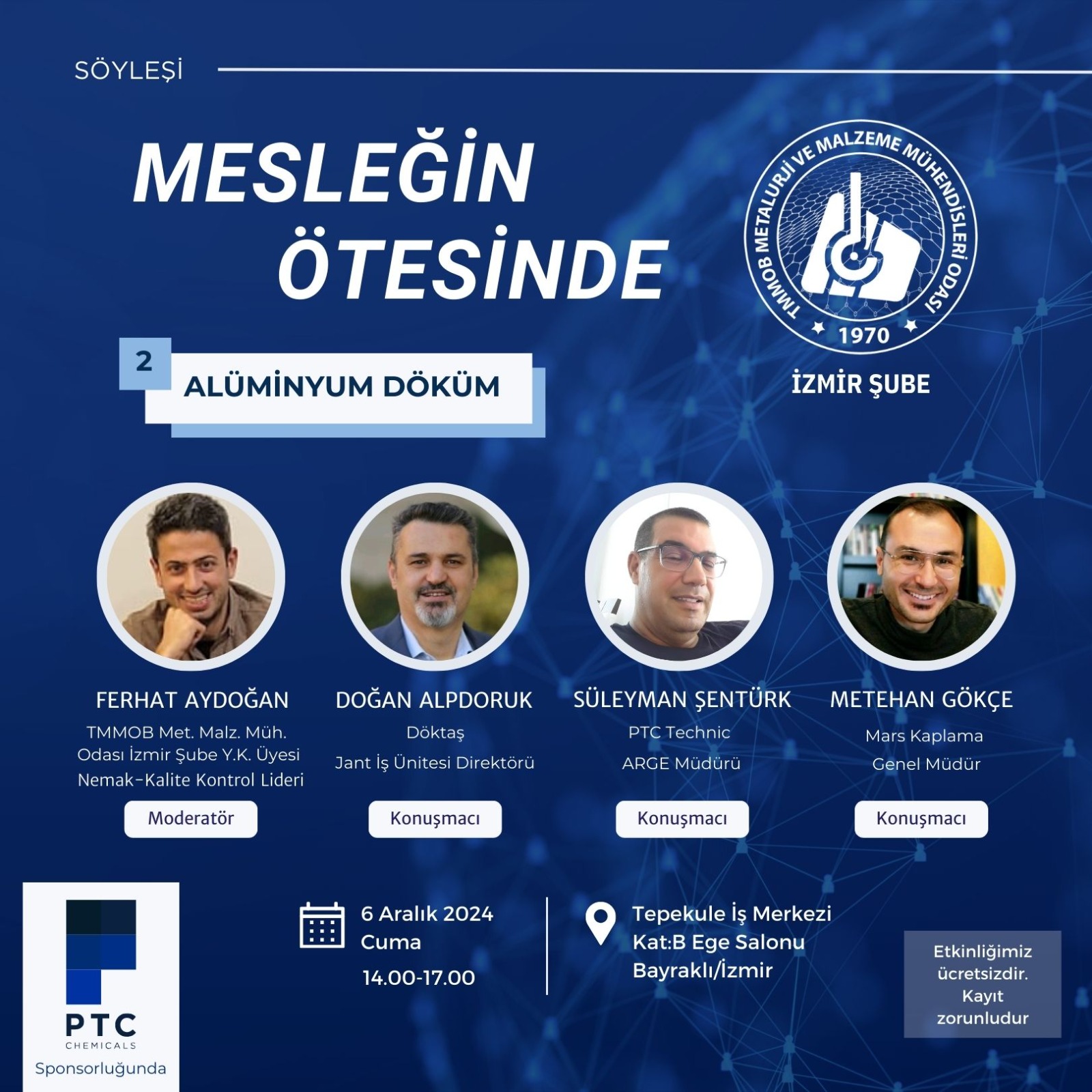 Sizleri, Mesleğin Ötesinde başlıklı söyleşi serimizin ikinci oturumu olan alüminyum dökümle ilgili önemli noktaların konuşulacağı "Mesleğin Ötesinde: Alüminyum Döküm’’ söyleşimizi yapıyoruz.