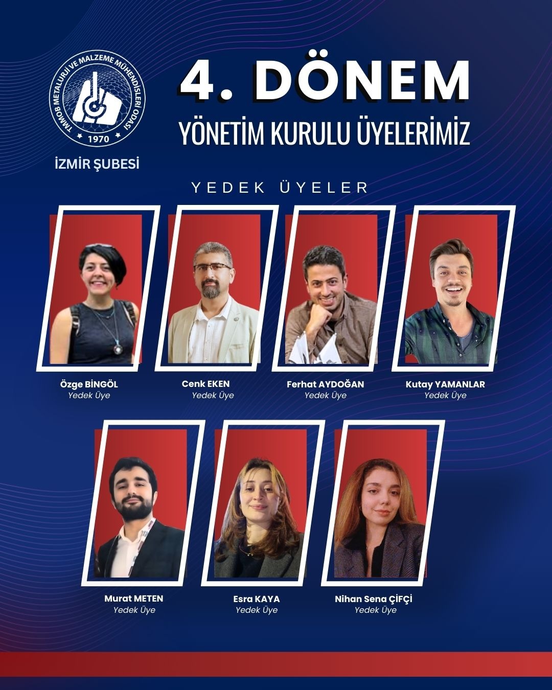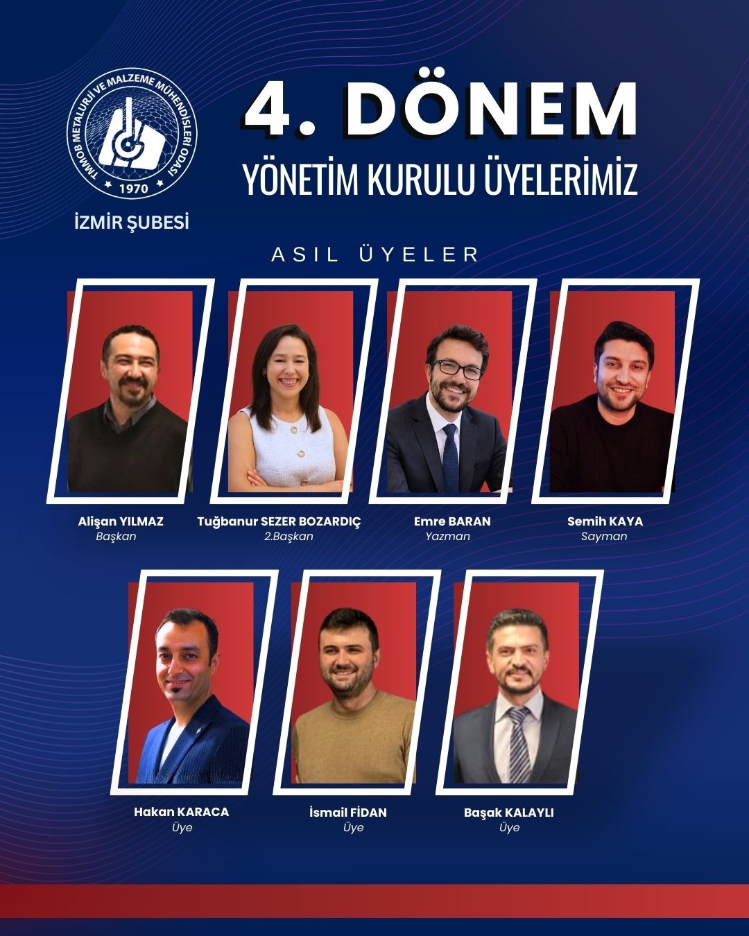 17-18 Ocak 2026 tarihlerinde gerçekleştirilen Metalurji ve Malzeme Mühendisleri Odası İzmir Şube 3. Olağan Genel Kurulu ve Seçimleri sonucunda göreve gelen Yönetim Kurulu üyelerimiz, görev dağılımını aşağıdaki şekilde belirlemiştir.
