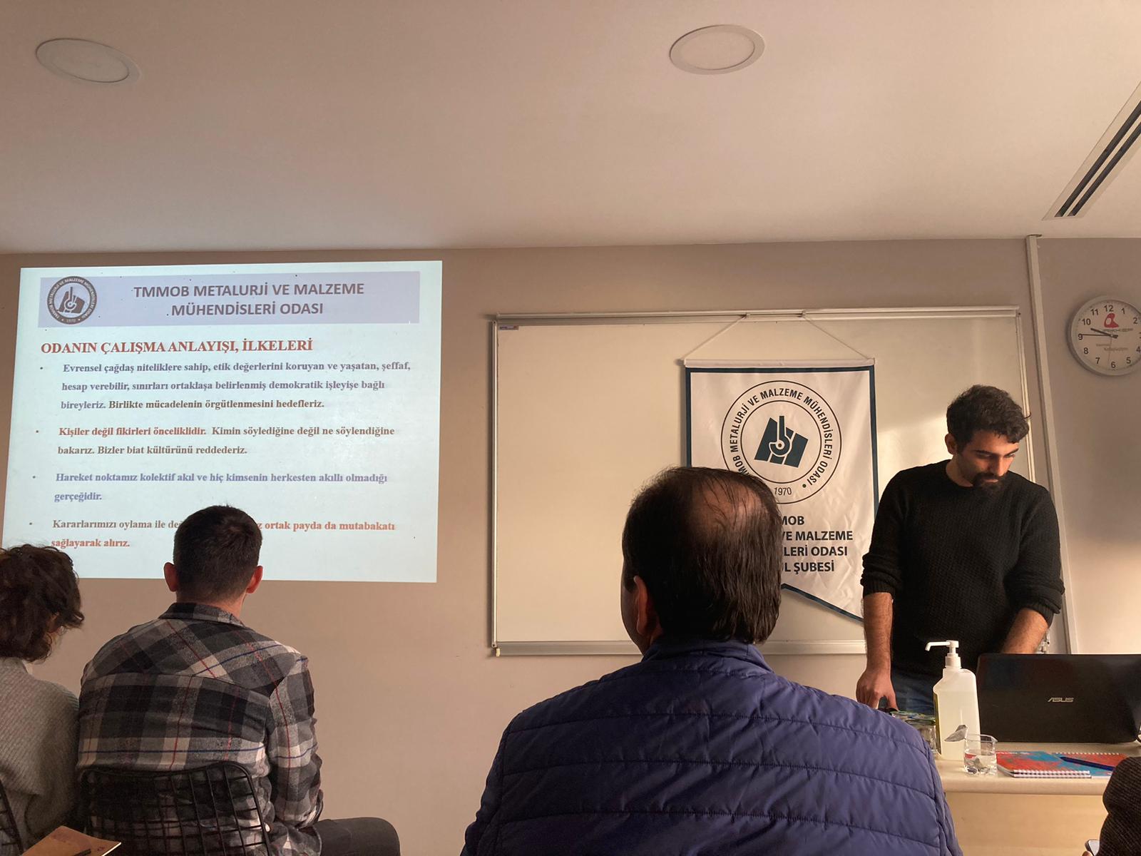 Sunum sonrasında toplantıya katılan üyelerimiz Odamızın örgütlenmesi ve etkinlikleri konusunda görüş ve önerilerini paylaştı. Özellikle genç arkadaşlarımızın örgütlenmeye dair beklentilerinin çokça fazla olduğu dillendirildi. Üyelerimizin görüşleri not edildikten sonra Şube binamızın bahçesinde hazırlanan kokteyl alanına geçilerek yılbaşı kutlamalarının da yapıldığı keyifli sohbetler günün ilerleyen saatlerine kadar devam etti.