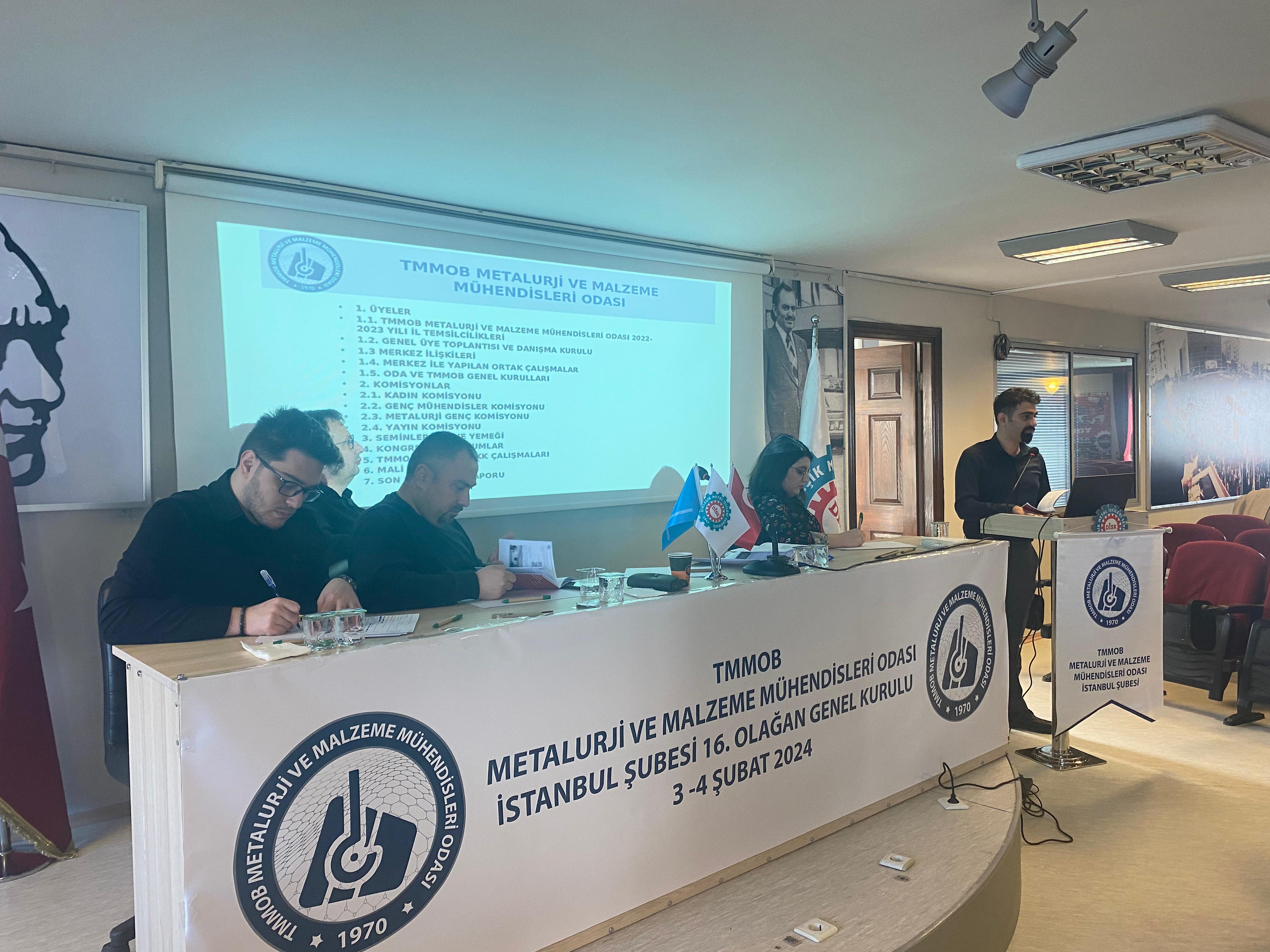 TMMOB Metalurji ve Malzeme Mühendisleri Odası İstanbul Şubesi 16.Olağan Genel Kurulu Toplantısı 3 Şubat 2024 tarihinde Birleşik Metal İş Genel Merkezi (Bostancı Mah. E80 Yanyol Cad. No:2 34744 Kadıköy - İSTANBUL) ve seçimler 4 Şubat 2024 tarihinde İstanbul Şube binamızda (Barbaros Mah. Yavuz Selim Cad. No:4 Ataşehir- İstanbul) çoğunluk aranmaksızın gerçekleştirildi.