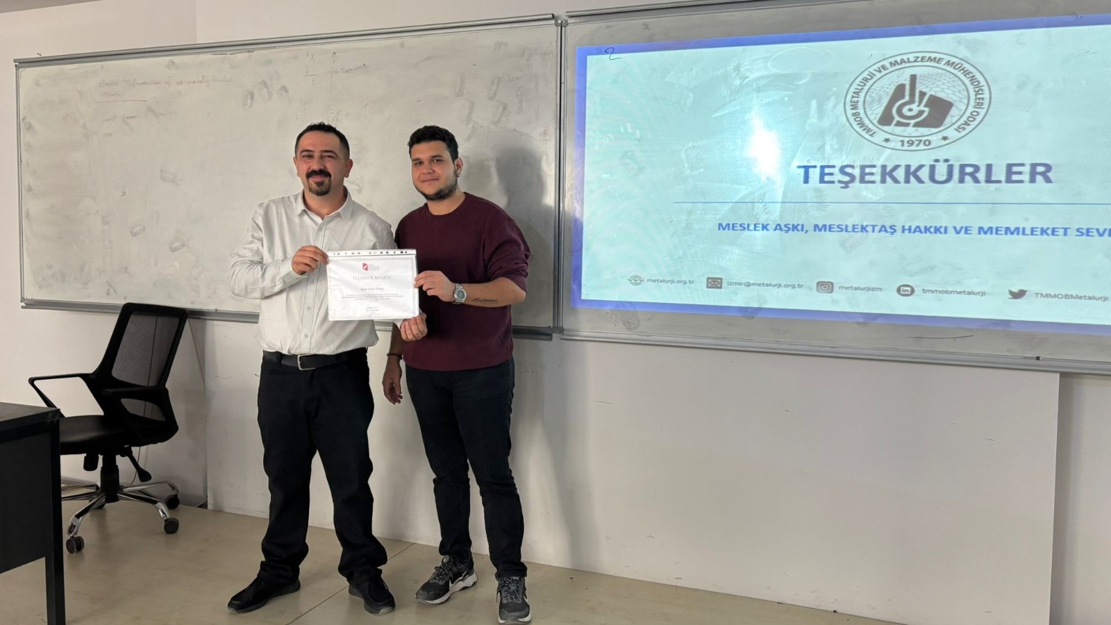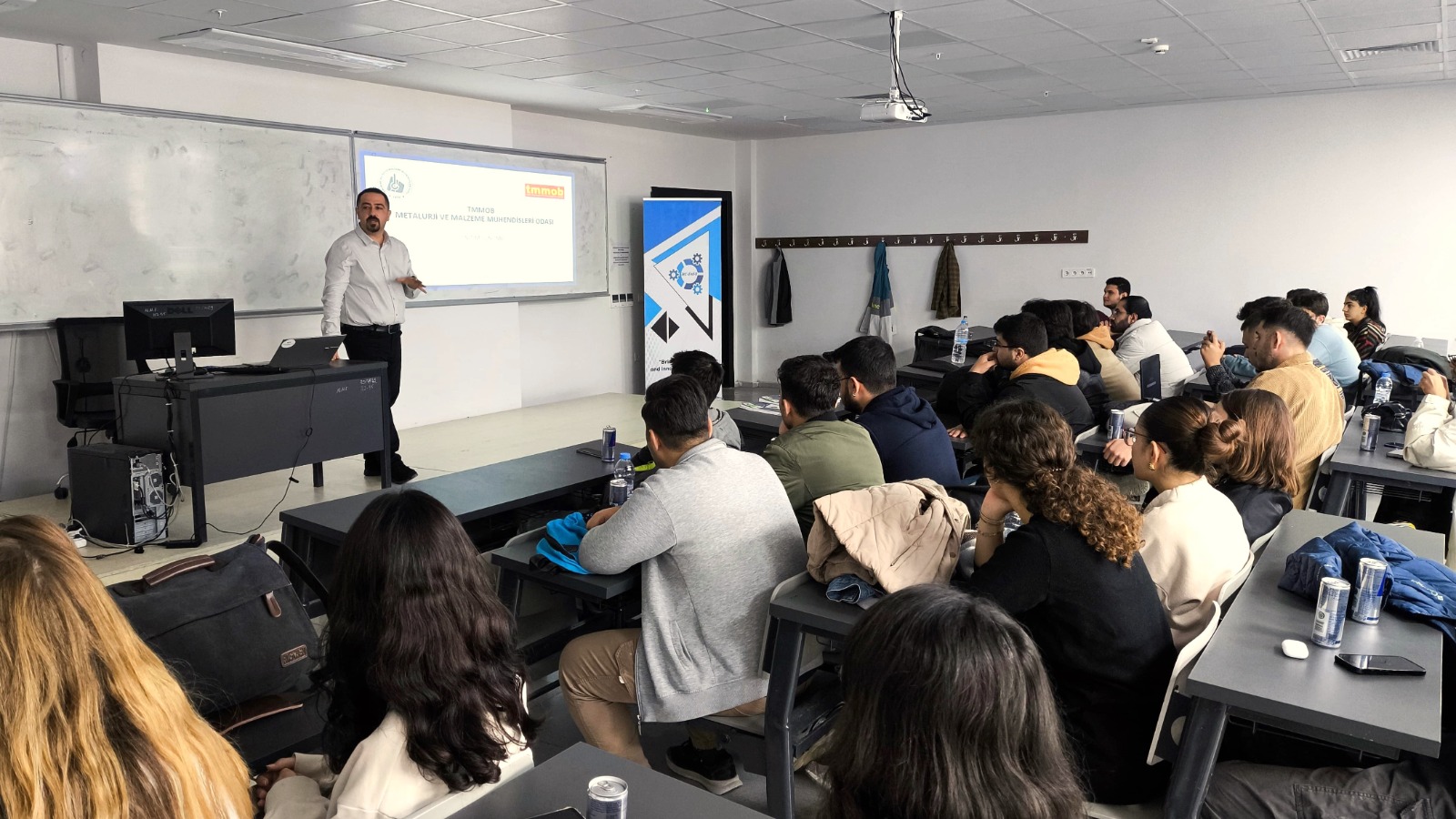 İzmir Katip Çelebi Üniversitesi Mühendislik Topluluğu'nun (İKC- ENSO) daveti üzerine 13 Kasım 2024 Çarşamba günü, İzmir Şube Yönetim Kurulu Yazman Üyesi Alişan Yılmaz tarafından Meslek, Meslek Odası ve Metalurji Genç tanıtımı yapıldı.