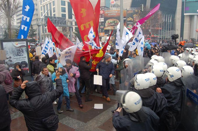 Saat 12.30’dan itibaren Güvenpark’ta toplanmaya başlayan TMMOB yönetici ve üyelerinin basın açıklaması yapmasına izin vermek istemeyen polis kitleye gaz sıkarak ve coplarla saldırdı.